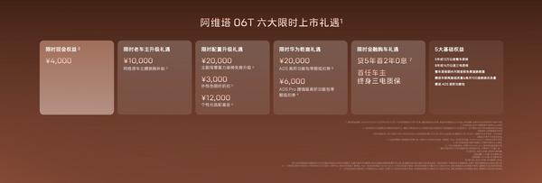 最后,阿维塔06T还推出了重磅购车礼遇。2026年5月31日(含)前下定可享至高价值6.9万元限时购车权益,包括现金权益、前排双零重力座椅、个性化选配基金等。另外,2026年5月10日(含)前下定,额外可享5000元保险补贴权益。